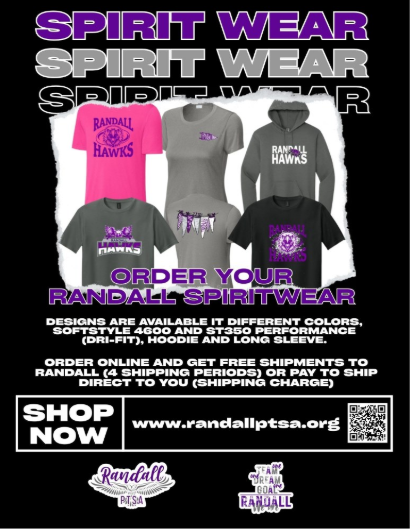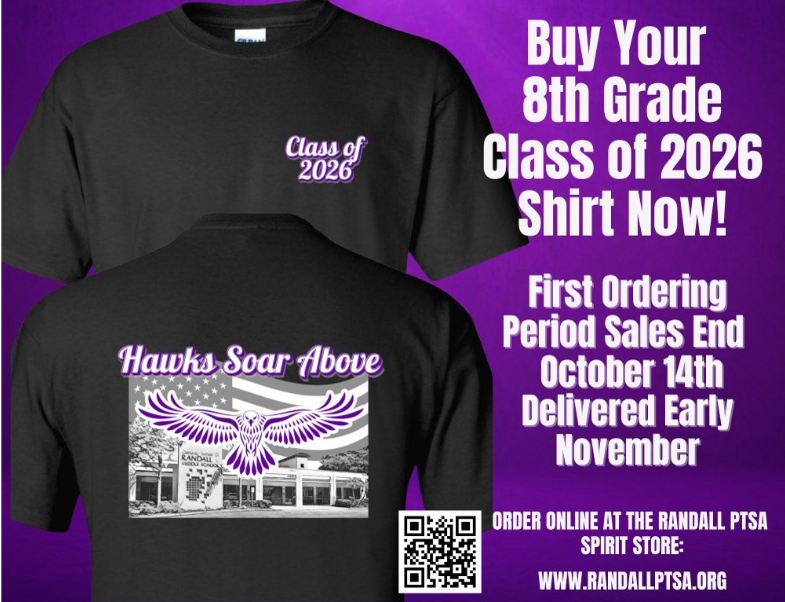 Randall PTSA is selling 8th grade grad shirts again this year! Shirts ordered by October 14th will be delivered to Randall in early November and distributed to students through homeroom. Shirts can be purchased HERE. Questions – please email Chris Barker, Randall PTSA Merchandise Chair at merchandise@randallptsa.org.